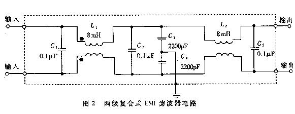 Obrázek 2 ukazuje druh vnitřního okruhu dvoustupňový složené EMI filtr, kvůli použití úrovně (také nazývané dva) filtrování, takže efekt filtrování šumu je lepší. Někteří uživatelé jsou tisíce Hz frekvence opakování zásahu skupiny rychlé přechodové puls, obě doma i v zahraničí také vyvinuly pulsní filtr skupiny (také známý jako skupina je schopna Čítač impulsů), inhibice narušení.